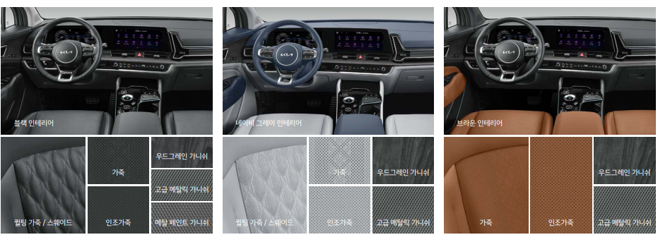 | 블랙 인테리어 4) | 블랙/네이비 그레이/브라운 인테리어 중 선택 가능 도어 암레스트 인조가죽 감싸기 고급 메탈릭 가니쉬(크래쉬패드, 도어) |