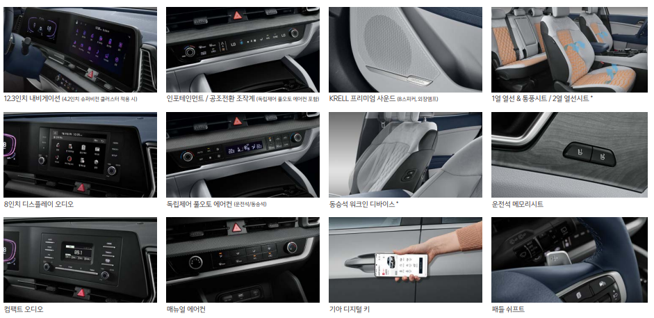 | (선택) 하이테크 89만 원 단, 12.3인치 내비게이션 선택 조건 파노라믹 커브드 디스플레이 슈퍼비전 클러스터(12.3인치 풀사이즈 칼라 TFT LCD) 기아 디지털 키 터치타입 아웃사이드 도어 핸들 스마트 폰 무선충전 시스템 |